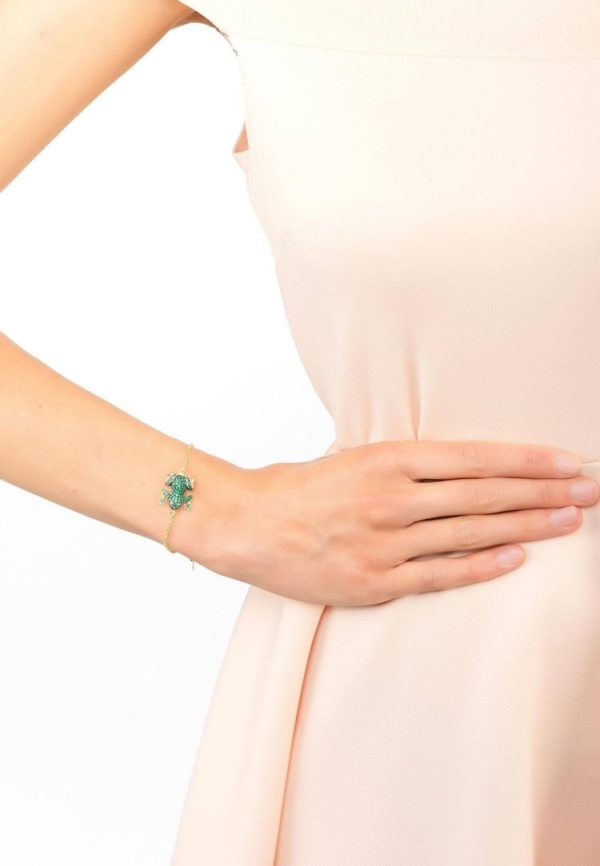 The frog prince bracelet features a three dimensional frog with lovely detailing, adorned with emerald green cubic zirconia which sparkle in the light. This item makes for an excellent birthday gift for a friend or loved one.