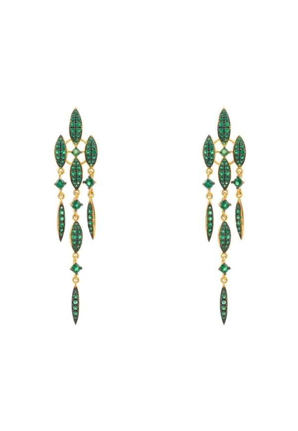 The Valencia statement drop earring, handcrafted in 925 sterling silver dipped in gold, dazzles with an abundance of emerald green sparkling zircons beautifully set within eight marquis shaped settings and single square cut zircons, all linked together in a triple strand drop design. The top four settings are fixed, while the others are linked by chain links, which gives the earrings a degree of flexibility for added sparkle as they move.