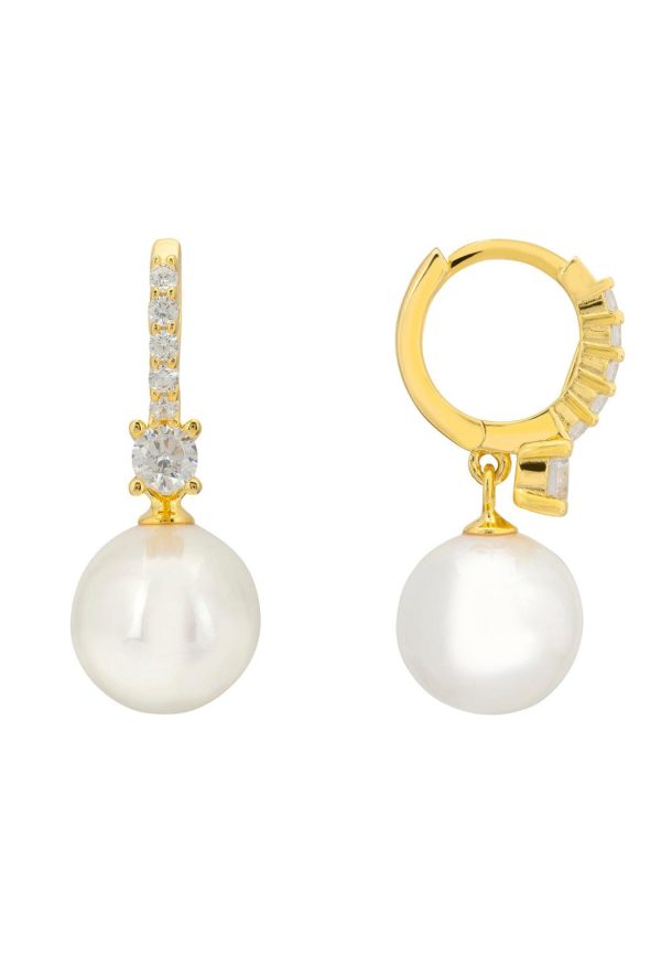The design features a delicate huggie hoop, beautifully embellished with a linear array of cubic zirconia that captures the light in every direction, climaxing in a larger zircon gem at the base. Below, a pristine white pearl dangles, symbolizing purity and grace.