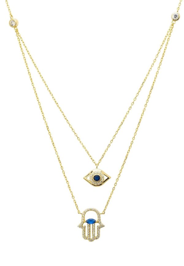 Introducing our Hamsa Hand And Evil Eye Layered Necklace in Gold. Made with 925 sterling silver dipped in 18ct gold, a double whammy of style and symbolism! Hanging on two separate chains, this dual-charm necklace adds a dash of sparkle to your look while keeping the bad vibes away.