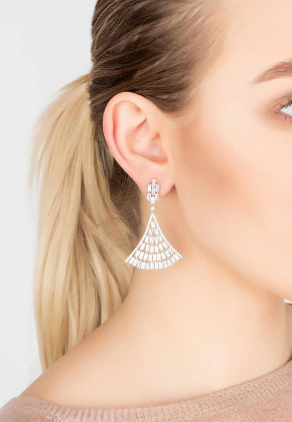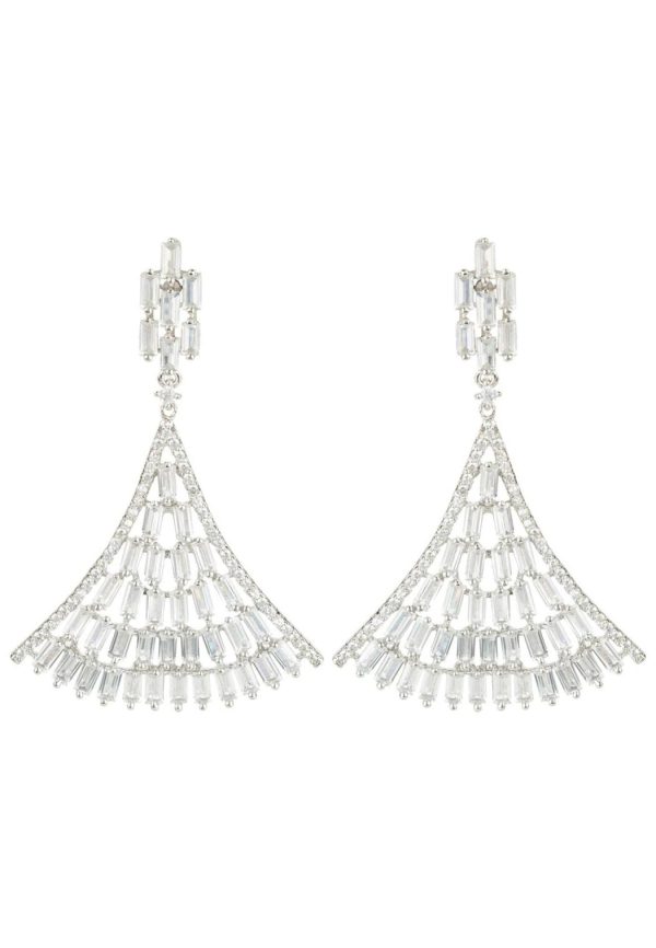 Take your look from okay to outstanding with our decadent Baguette Fan Tail Earrings in silver. Inspired by the glamorous 1920’s these art deco fan tail earrings are expertly crafted from 925 sterling silver and hand set with micro pave white zircons and magnificent baguette cut zircons for extra sparkle, that catch the light from all angles with the natural movement of wearing them.