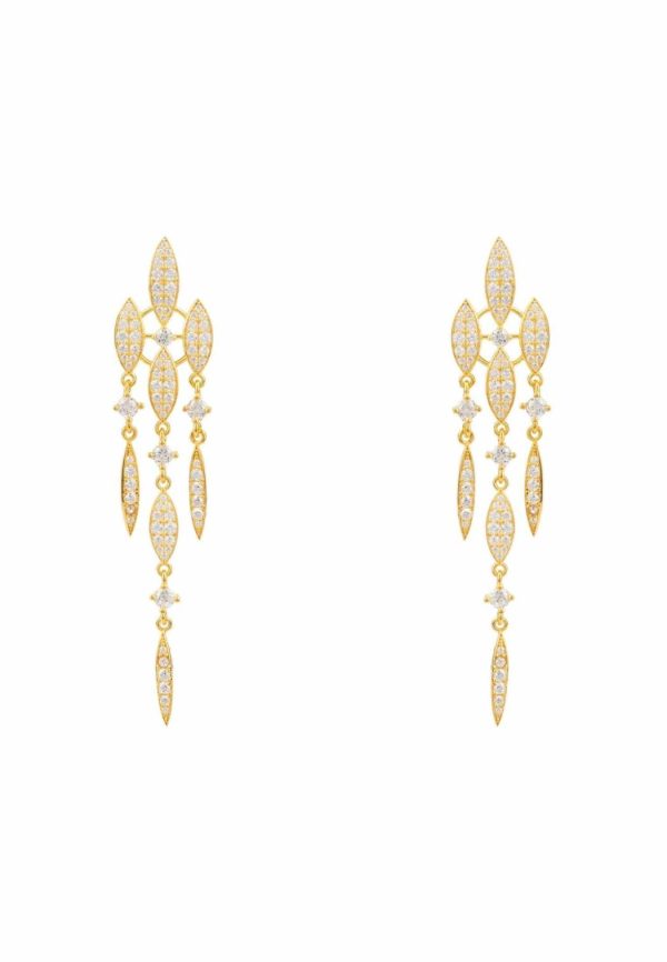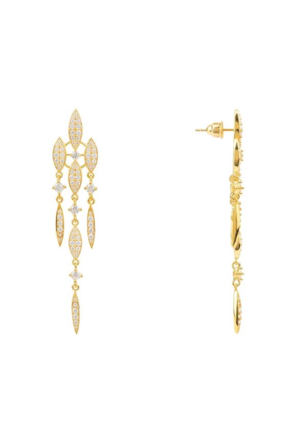 The Valencia statement drop earring, handcrafted in 925 sterling silver dipped in gold, dazzles with an abundance of white sparkling zircons beautifully set within eight marquis shaped settings and single square cut zircons, all linked together in a triple strand drop design. The top four settings are fixed, while the others are linked by chain links, which gives the earrings a degree of flexibility for added sparkle as they move.