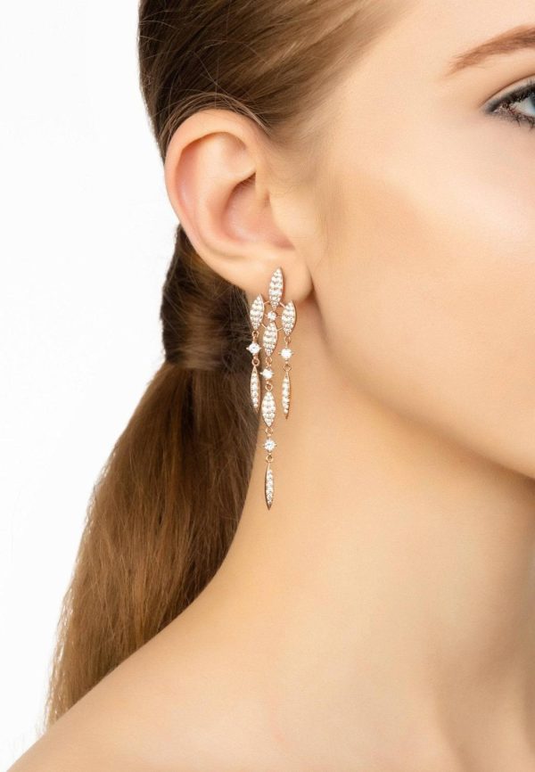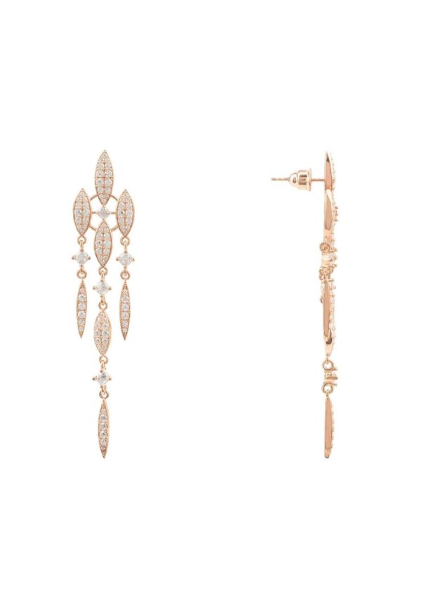 The Valencia statement drop earring, handcrafted in 925 sterling silver dipped in rosegold, dazzles with an abundance of white sparkling zircons beautifully set within eight marquis shaped settings and single square cut zircons, all linked together in a triple strand drop design. The top four settings are fixed, while the others are linked by chain links, which gives the earrings a degree of flexibility for added sparkle as they move.