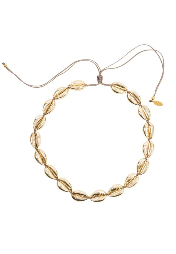 Take a look at our Cowrie shell choker strand necklace – an elegant and chic statement piece that radiates with a metallic shine. In the design of a row of golden cowrie shells set along an adjustable strand, this necklace is perfect for adding a touch of nature-inspired glamour to any outfit, whether you’re dressing up for a special occasion or keeping it casual.