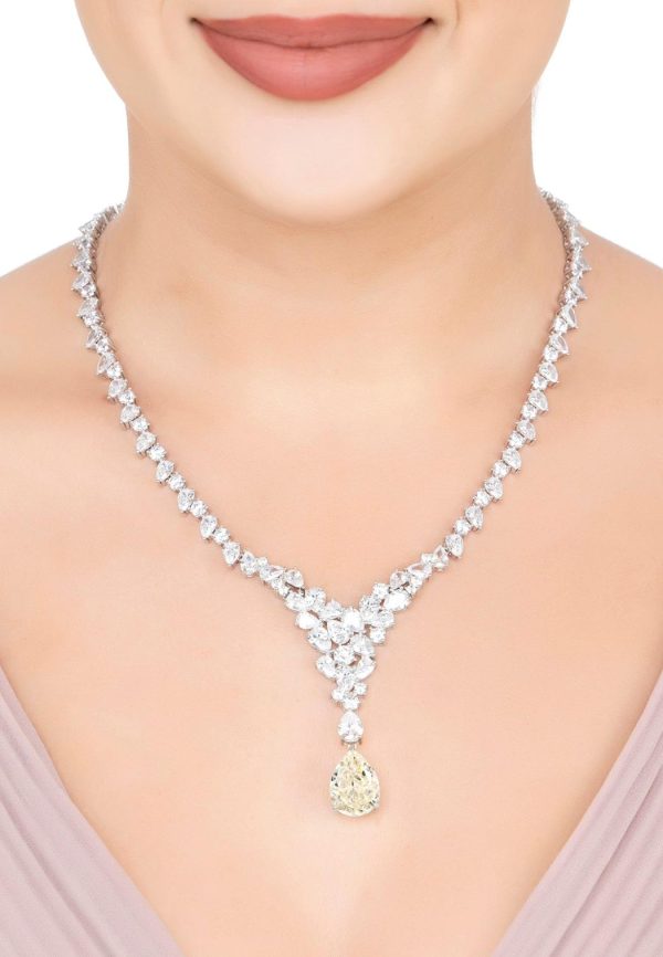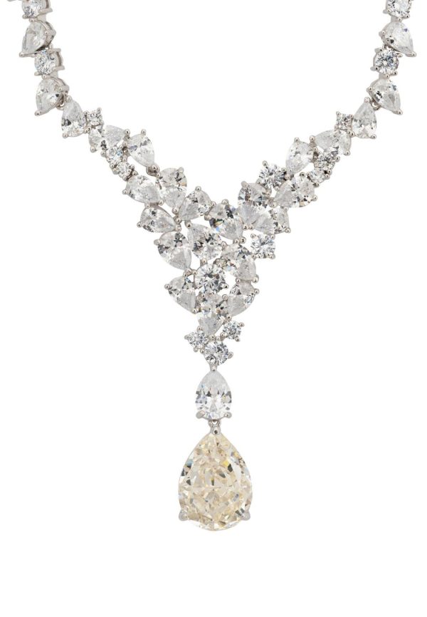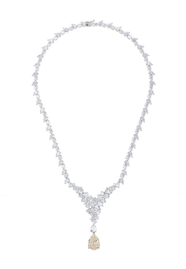Discover unparalleled elegance with the Lydia Statement Necklace in Moissanite Silver. Weighing 45.5 grams, this breathtaking piece is crafted in 925 sterling silver to captivate with its exceptional brilliance. The necklace is adorned from end to end with simulated diamonds, culminating in a fixed triangular formation at the front, creating a stunning focal point. Suspended from the tip of this dazzling triangle is a teardrop-shaped lab-grown Moissanite gemstone, renowned for its brilliance, even surpassing that of a diamond.