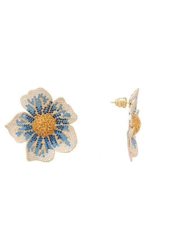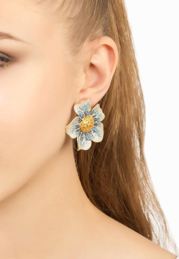 These large pansy earrings are adorned with sparkling cubic zirconia, with graduated shades of blue through to white on the petals and vibrant yellow at its centre. Three dimensional in design for added interest, which will add a touch of sophisticated style to any outfit.