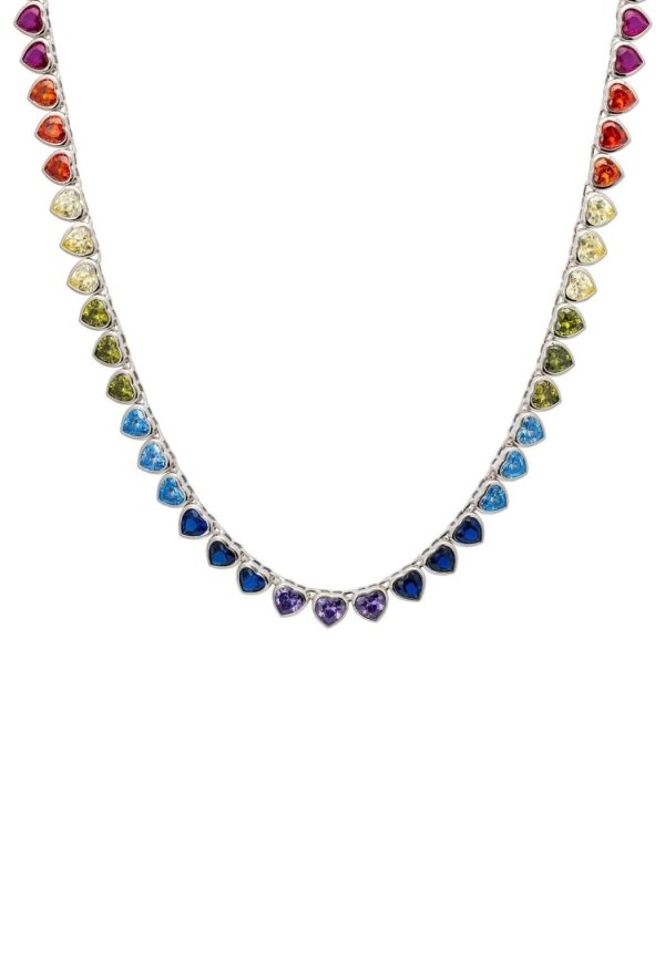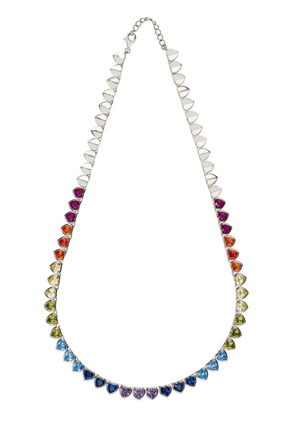 The entire length is adorned with a series of hearts, the hearts to the front are set with an assortment of eye-catching, lab-created gemstones. From blue topaz and peridot to lemon topaz, amethyst and more, to create a rainbow effect that’s sure to brighten your day and your look. The remaining hearts keep it classy, with a polished silver finish giving off a shine that’s just as captivating.